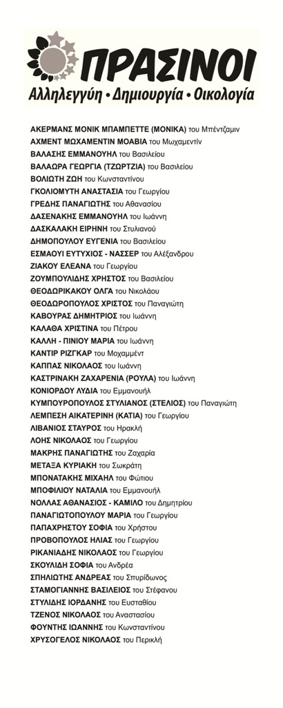 Πράσινο: To περιβάλλον όχι μόνο δεν πρέπει να προσεγγίζεται ως τροχοπέδη για την ανάπτυξη, αλλά αντιθέτως η αειφόρος διαχείρισή του μπορεί να αποτελέσει σημαντικό εργαλείο διεξόδου από την κρίση. Θέση μας αποτελεί ότι η οικονομική και κοινωνική κρίση συνδέεται άμεσα με την περιβαλλοντική και κλιματική. Η προστασία του περιβάλλοντος, μαζί με τη δημοκρατία και την κοινωνική συνοχή, είναι προϋποθέσεις για μια βιώσιμη οικονομία. Είμαστε ενεργοί πολίτες με επαγγελματική, ακαδημαϊκή και κοινωνική δραστηριότητα σε θέματα που αφορούν στο περιβάλλον, την έρευνα και καινοτομία, την κοινωνική αλληλεγγύη, την υπεύθυνη παραγωγή, την προάσπιση των ανθρωπίνων δικαιωμάτων, την κοινωνική ένταξη, την διεκδίκηση των δικαιωμάτων των ατόμων με αναπηρία, την διεκδίκηση ενός αποτελεσματικού συστήματος υγείας.